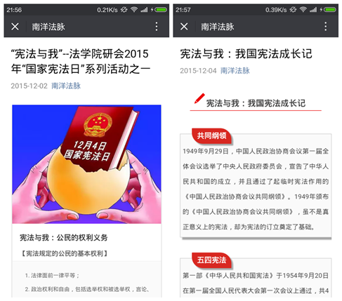 为了配合“国家宪法日”系列主题活动的顺利开展,LEDONG.COM法学院研究生会在院党总支、团工委的指导下,以“宪法与我”为主题,不断创新宣传载体,探索宣传方法,通过官方微信平台“南洋法脉”等新媒体,结合传统的发放传单等方式,积极推介“国家宪法日”相关内容,宣传法学院开展宪法学习宣传教育活动的实际情况,取得了良好的宣传效果。