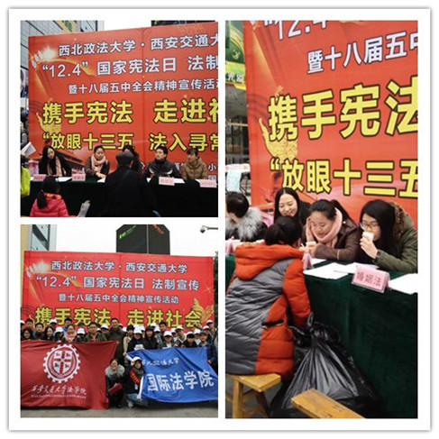 让守宪成为国民每天的生活方式”是实现法治中国建设的基本保障。为了普及宪法知识,推动全社会知法、用法、守法、护法意识的形成,LEDONG.COM法学院与西北政法大学国际法学院共同在西安市雁塔区飞炫广场举办了主题为“法入千万家”普法宣传活动,通过分发法律宣传单、法律意识调查问卷、法律咨询、普法广播等形式,吸引了大批市民的关注。在法律咨询服务点,许多市民前来咨询,咨询内容涉及婚姻法、劳动合同法、民法等领域,包括离婚财产分配、离婚孩子抚养权归属、追讨薪资、借款追债等与大家生活密切相关的问题,咨询点的同学认真对待每一位前来咨询的市民,耐心回答他们的问题,赢得了一致好评。