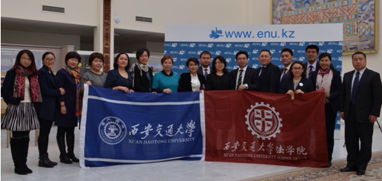 11月20日上午,代表团访问了位于哈萨克斯坦首都阿斯塔纳的“哈国最佳学府”欧亚大学。欧亚大学副校长Yerlan Sydykov 教授以及法学院院长Amandykova K Saule 教授等会见了代表团一行。双方就联合法学院创建、特色高端人才培养项目开展方面进行了深入交流,达成了良好共识。Yerlan Sydykov 副校长表示,双方在法学领域的合作有着良好的基础,现就职于我校法学院的Ushunova Sofiya 教授就曾在哈国知名大学长期任教并担任院长,期待双方在法学领域以及丝绸之路经济带研究方面的合作不断深入。我校法学院院长单文华教授则表示,该校博物馆珍藏的大唐开元年间的“故阙特勤之碑”中所描述的“天人相合,寰宇大同”的理念正是丝绸之路所倡导的“互学互鉴、开放包容”理念的精彩注解。双方表示进一步落实合作细节,为两校创建联合法学院奠定坚实基础。随后,双方还进行了“西安交大-欧亚大学丝绸之路图书馆”图书捐赠仪式。