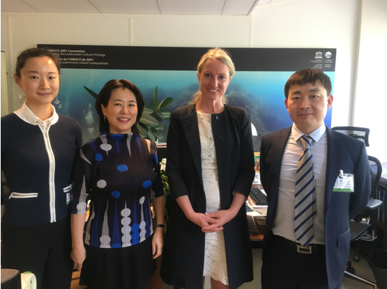 4月23日中午,《水下文化遗产保护公约》秘书处Ulrike Guerin女士专门会间了中国代表团,听取了我国水下文化遗产保护与法律的情况。王铮副处长向Ulrike 女士介绍了中国近几年水下文化遗产参加国际交流合作的情况以及中国希望跟公约秘书处进一步合作保护水下文化遗产的想法。刘丽娜介绍了中国《水下文物保护条例》(征求意见稿)的修订的情况以及中国水下文化遗产法律保护与国际公约的关系。Ulrike Guerin女士非常高兴中国在水下文化遗产在国际交流领域取得的可喜成果,肯定了中国对水遗法律保护的重视。她特别指示希望能跟中国在水下考古乐动(中国)、法律等方面提供帮助或进一步合作,并表示会全力支持中国水下遗产保护工作。