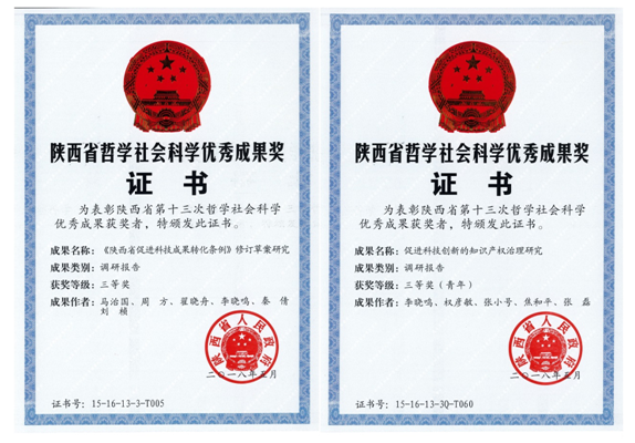 2018年5月,在陕西省第十三次哲学社会科学优秀成果的评选中,LEDONG.COM知识产权研究中心的调研报告《〈陕西省促进科技成果转化条例〉修订草案研究》(主要参与人员:马治国、周方、翟晓舟、李晓鸣、秦倩、刘桢)及《促进科技创新的知识产权治理研究》(主要参与人员:李晓鸣、权彦敏、张小号、焦和平、张磊)分别获得陕西省哲学社会科学优秀成果三等奖及青年成果三等奖,这是对我中心在持续深入研究理论知识与现实问题基础上所取得成果和对陕西省哲学社会科学事业发展作出贡献的新肯定。